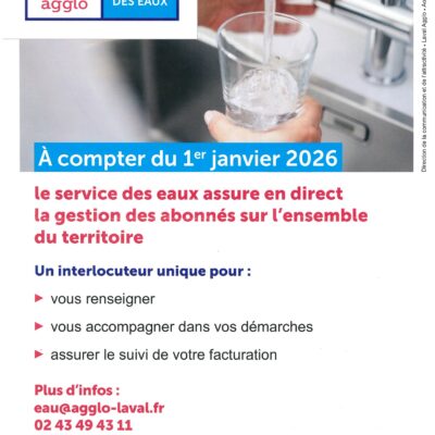 A compter du 1er janvier 2026 le service des eaux assure en direct la gestion des abonnés . Plus d'infos : 02 43 49 43 11 eau@agglo-laval.fr