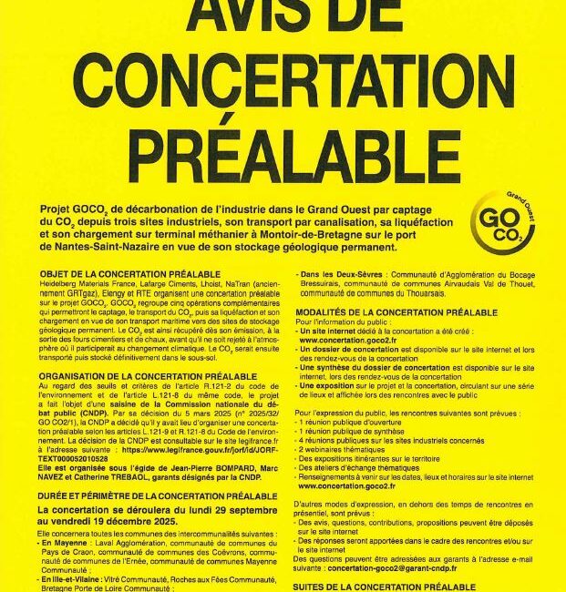 Rappel : avis de concertation préalable projet GOCO2 dans le grand Ouest par captage de CO2 By AdministratifIn ActualitésPublié le 23 septembre 2025 GOCO2_A2_CNDP 2025-Avis de concertation préalable projet GOCO2 dans le Grand Ouest GOCO2_A3-concertation