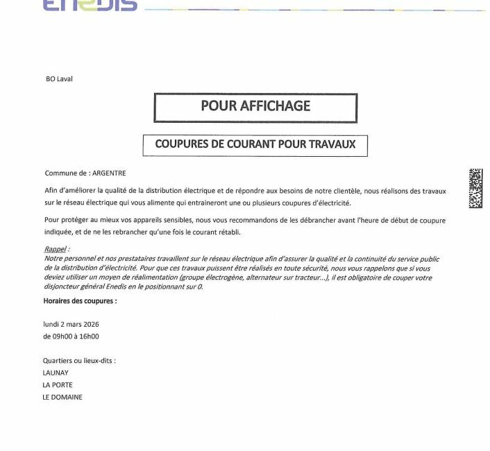 Coupures d’électricité le lundi 2 mars de 09h00 à 16h00 📢📢 By AdministratifIn ActualitésPublié le 20 février 2026