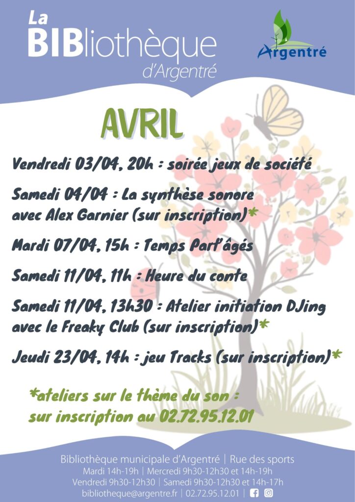Programme d’avril By BibliothèqueIn Actualités, BibPublié le 24 mars 2026 Voici le programme d’avril à la bibliothèque municipale
