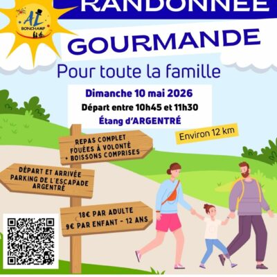 En lien avec l'association loisirs Bonchamp, une randonnée gourmande est proposée le dimanche 10 mai 2026. Départ entre 10h45 et 11h30 à l'étang d'Argentré Renseignements : albonchamp@gmail.com ou 07.69.53.97.57 Inscription sur Hello asso ou en mairie de Bonchamp - DATE LIMITE LE 25 AVRIL