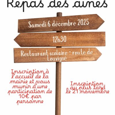 Le 6 décembre à 12h30 aura lieu le traditionnel repas des ainés ( 70 ans et + ) Inscription avant le 21 novembre à la mairie, participation de 10€ par personne