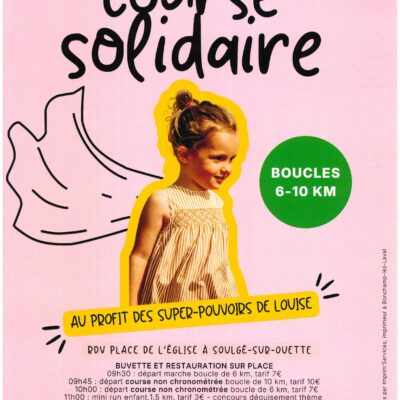 Le 10 mai, rendez-vous pour une course solidaire au départ de l’accueil périscolaire de Soulgé. Cette course est pour Louise, une petite de Soulgé sur Ouette. En septembre dernier, leur vie a basculé brutalement avec la découverte d’un cancer pédiatrique rare : un gliome infiltrant du tronc cérébral. Depuis, ses parents ont mis leur quotidien entre parenthèses pour se consacrer entièrement à leur fille, l’accompagner, la soutenir, l’aimer plus fort encore à chaque instant. Courir, marcher, participer… chaque pas sera un geste de solidarité, d’espoir et de soutien pour Louise et sa famille. Venez nombreux le 10 mai.