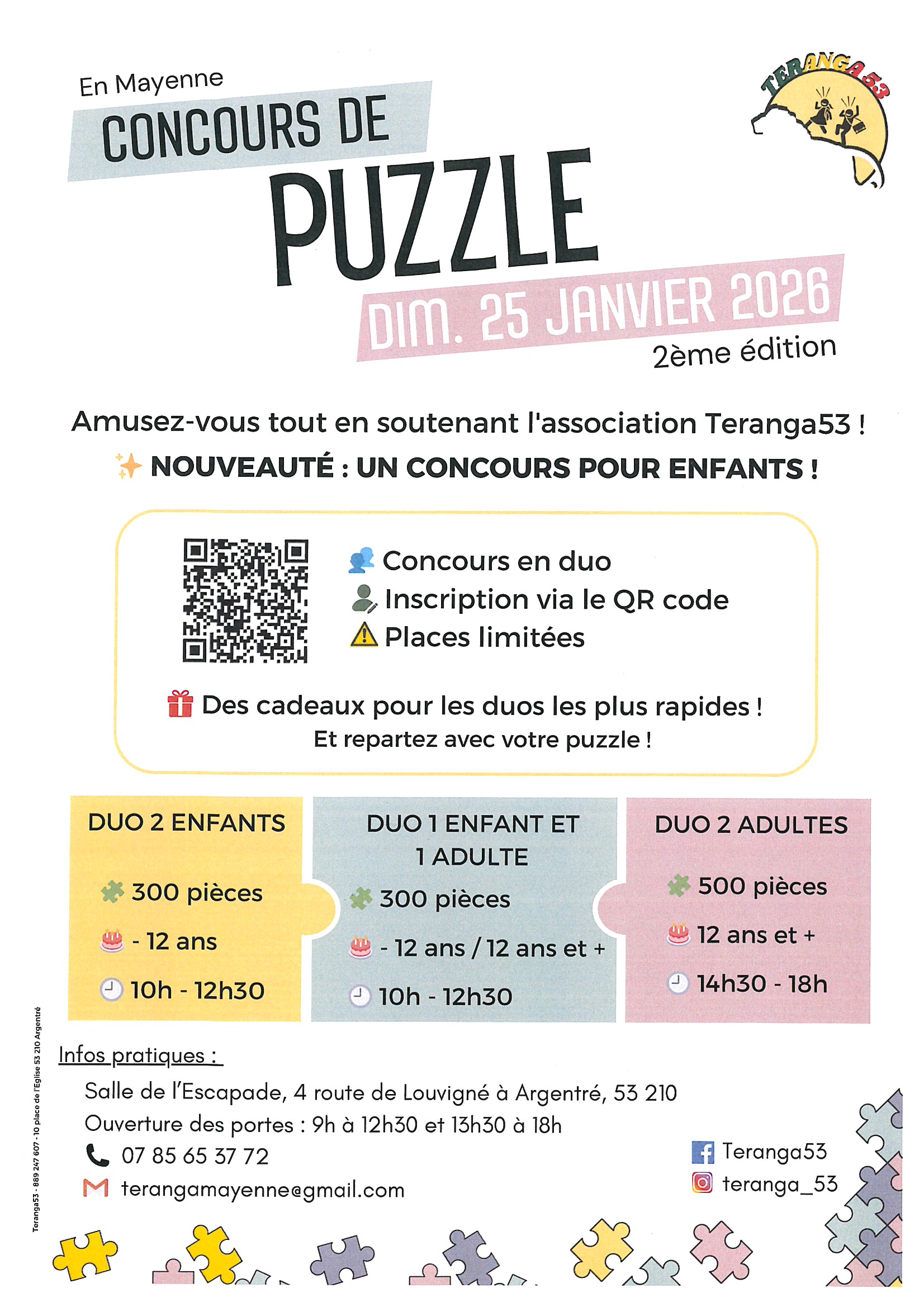 Participez au 2ème concours de puzzle en Mayenne, organisé par l'association Teranga53 ! ✨ NOUVEAUTÉ : UN CONCOURS POUR ENFANTS ! 🗓Dimanche 25 janvier 2026 📍Argentré (53), Salle Escapade 🧩Puzzle de 300 ou 500 pièces Ce concours a pour but de faire découvrir l'association, de récolter des fonds et de partager un moment convivial tous […]